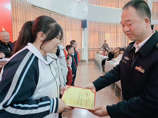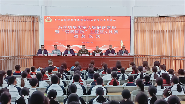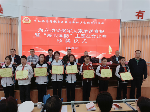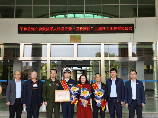 圖為平和縣人武部政委郭毅置為曾致銜頒發(fā)喜報 在師生代表的見證下,平和縣人武部政委郭毅置為曾致銜及家屬佩戴上“榮立三等功,軍屬光榮”綬帶,送上立功喜報及慰問金。曾致銜則和當(dāng)?shù)赜嘘P(guān)部門一起,為獲得主題征文獎的師生頒發(fā)榮譽(yù)證書,現(xiàn)場響起雷鳴般掌聲。 立功喜報送到功臣母校,既增強(qiáng)了現(xiàn)役軍人及其家庭成員的榮譽(yù)感,也用生動、走心的方式,為學(xué)生們上了一堂沉浸式的國防教育課。