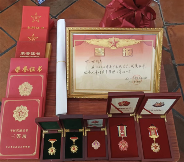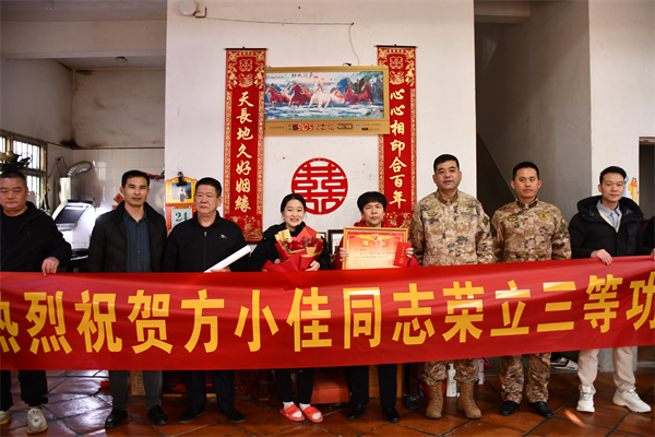 他是誰? 他是方小佳,云霄縣莆美鎮(zhèn)中柱村人 現(xiàn)任陸軍某部副連長 “咚咚鏘、咚咚鏘......”一陣陣喜慶的鑼鼓聲響徹街頭巷尾。1月24日,云霄縣人武部、縣退役軍人事務(wù)局組成軍地報喜小分隊,為榮立平時教育管理三等功的方小佳家庭送喜報,與軍屬共享榮耀和喜悅。 “您兒子一年為國家培養(yǎng)28名軍官,取得了令人驕傲的成績!離不開你們在背后默默無聞的支持”。在方小佳家中,縣人武部部長李超為軍屬披綬帶,頒發(fā)立功受獎喜報,與軍屬進行親切交談,向他們致以親切的慰問和崇高的敬意。