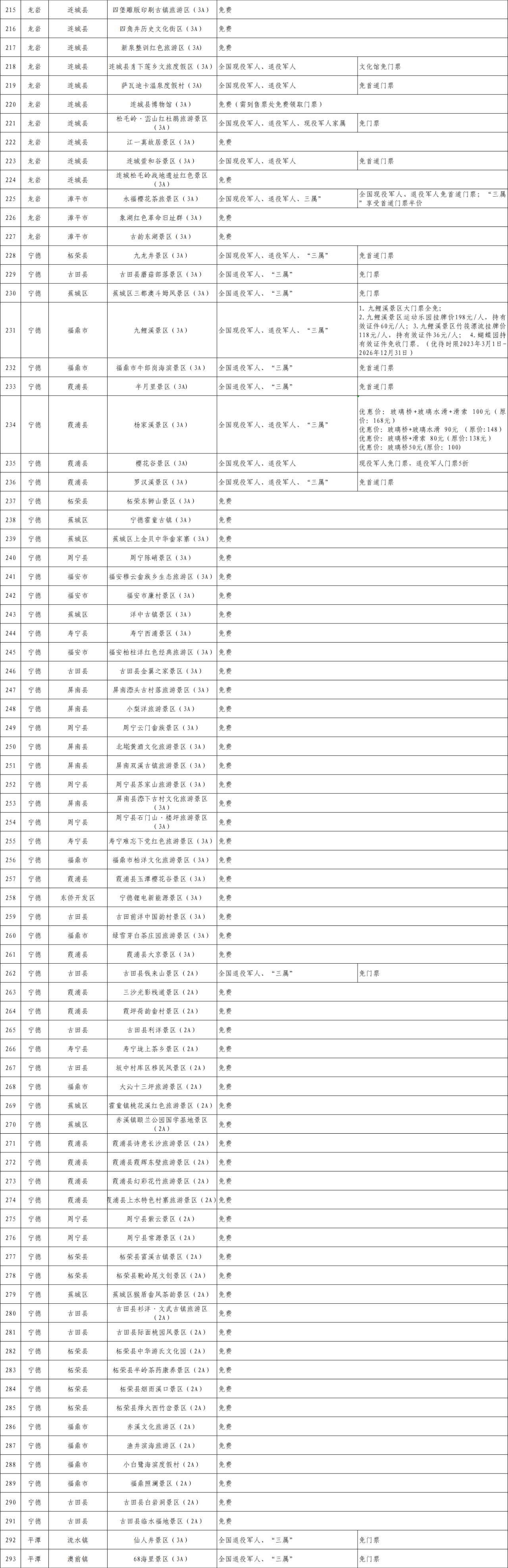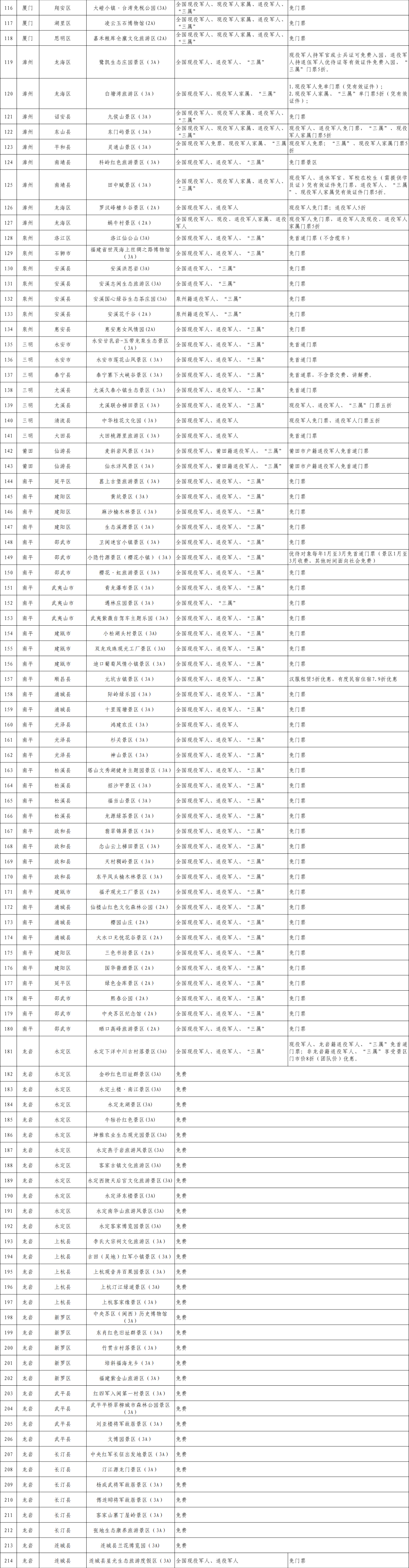 尊崇不間斷,優(yōu)待常出新。近日,福建省退役軍人事務(wù)廳聯(lián)合省文化和旅游廳全力推動(dòng)近300家A級(jí)景區(qū),面向退役軍人及其他優(yōu)撫對(duì)象提供優(yōu)待政策,有的門(mén)票五折,有的全免。其中,5A級(jí)景區(qū)11家12處、4A級(jí)景區(qū)84家、3A級(jí)以下景區(qū)197家。 下面,讓我們看看具體減免門(mén)票的景區(qū)。友情提醒您:出游前,記得攜帶優(yōu)待證! 福州市三坊七巷歷史文化街區(qū)(5A) 優(yōu)待對(duì)象范圍:全國(guó)現(xiàn)役軍人、退役軍人、“三屬” 廈門(mén)市鼓浪嶼風(fēng)景區(qū)(5A) 優(yōu)待對(duì)象范圍:全國(guó)現(xiàn)役軍人、現(xiàn)役軍人家屬、退役軍人、“三屬” 漳州市福建土樓(南靖)旅游區(qū)(5A) 優(yōu)待對(duì)象范圍:全國(guó)現(xiàn)役軍人、退役軍人、“三屬” 武夷山市武夷山風(fēng)景名勝區(qū)(5A) 優(yōu)待對(duì)象范圍:全國(guó)退役軍人、“三屬”、全國(guó)愛(ài)國(guó)擁軍模范、全國(guó)擁政愛(ài)民模范 福建省A級(jí)旅游景區(qū)優(yōu)待項(xiàng)目清單 (點(diǎn)擊圖片可查看大圖)圖片