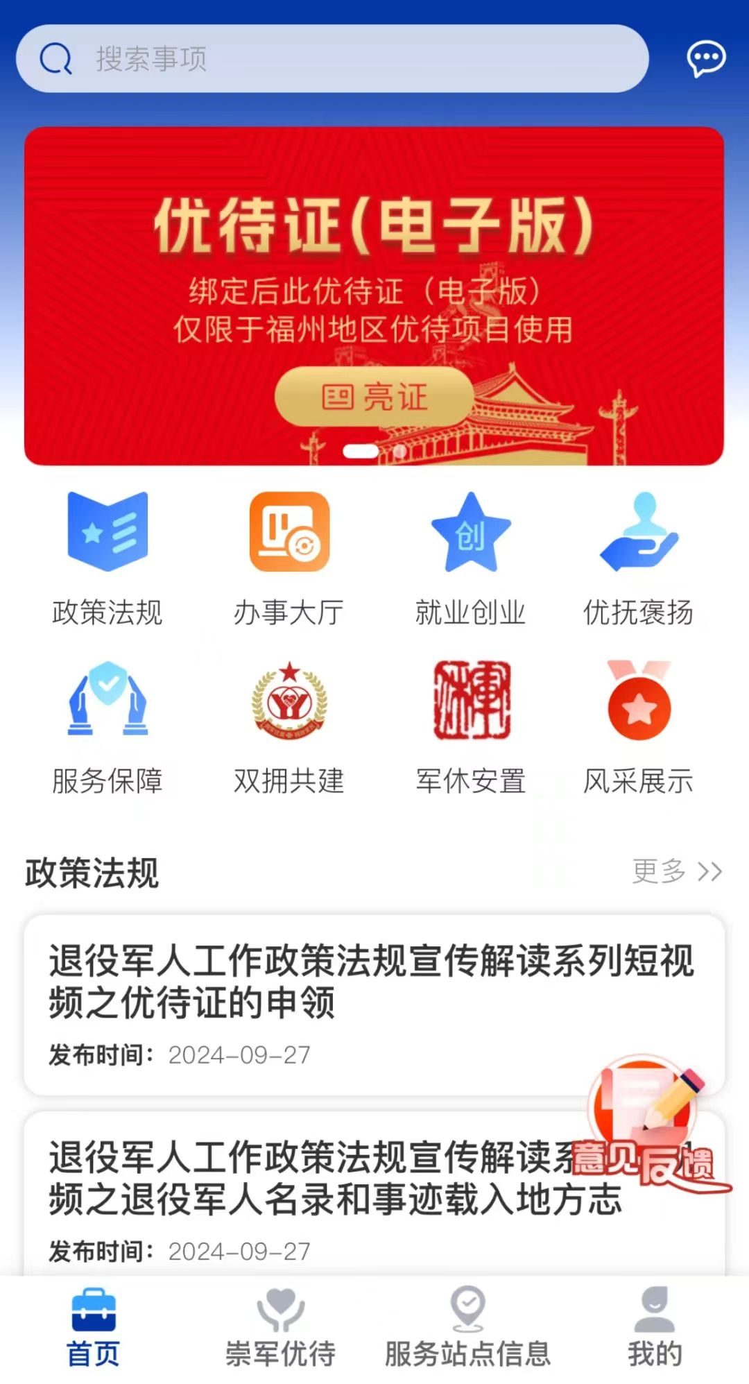 平臺(tái)首頁(yè)及辦事大廳 “榕城老兵”一體化平臺(tái)(福州市“網(wǎng)上退役軍人事務(wù)局”)依托“e福州”APP運(yùn)行。開(kāi)設(shè)政策法規(guī)、辦事大廳、就業(yè)創(chuàng)業(yè)、優(yōu)撫褒揚(yáng)、服務(wù)保障、雙擁共建、軍休動(dòng)態(tài)、崇軍優(yōu)待、服務(wù)站點(diǎn)信息等服務(wù)版塊,提供服務(wù)中心(站)預(yù)約辦事、創(chuàng)新創(chuàng)業(yè)大賽報(bào)名、志愿者注冊(cè)、光榮牌申領(lǐng)、革命烈士紀(jì)念館預(yù)約、宣講員申請(qǐng)、擁軍優(yōu)屬商業(yè)聯(lián)盟申請(qǐng)及查詢等服務(wù)。 下一步,福州市退役軍人事務(wù)局將依托“數(shù)字福州”建設(shè)成果,整合接入更多福州市優(yōu)待項(xiàng)目和退役軍人事務(wù)系統(tǒng)綜合業(yè)務(wù)功能,持續(xù)強(qiáng)化平臺(tái)建設(shè),為退役軍人提供更加優(yōu)質(zhì)、高效的服務(wù)保障。 |