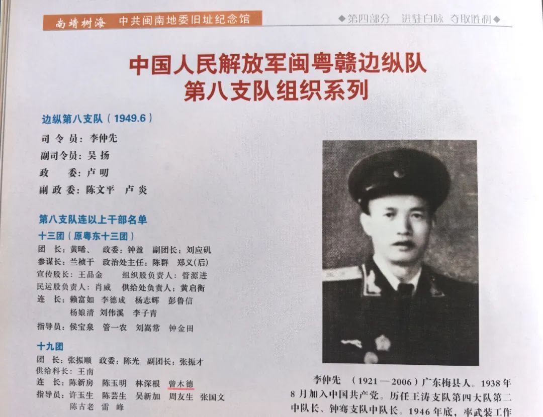 曾木德的養(yǎng)父曾水港是一名地方工作隊(duì)員,負(fù)責(zé)在平和縣內(nèi)為游擊隊(duì)秘密傳遞情報(bào)、運(yùn)送物資及軍需用品。在養(yǎng)父的教育影響下,曾木德也萌發(fā)了跟隨共產(chǎn)黨參加革命的理想。 “我們當(dāng)時(shí)沒(méi)有吃,條件非常艱苦,槍械又落后,自己打草鞋,很久才發(fā)一套軍裝。”回憶起往事,曾木德說(shuō),為避開(kāi)國(guó)民黨軍隊(duì)襲擊,他們常年住在深山密林,走在崎嶇山路。主要以南勝歐寮村和云霄烏山為根據(jù)地,在南靖、平和、漳浦宣傳革命政策、攻打國(guó)民黨陣地,也曾被調(diào)到廣東饒平、大埔、龍巖永定、江西等地支援。 “將近六年的時(shí)間沒(méi)蓋過(guò)棉被,一直都在山上打游擊?!闭劶叭胛槌跣模镜卤硎?,由于養(yǎng)父的秘密身份暴露,在平和縣霞寨圩被國(guó)民黨反動(dòng)派逮捕后殘酷殺害。全家得訊后極度悲傷憤怒,但敵人的殘暴沒(méi)有動(dòng)搖他革命的信念。他懷著家仇國(guó)恨,委托姐妹和鄉(xiāng)親們簡(jiǎn)單處理養(yǎng)父后事,便返回部隊(duì)繼續(xù)戰(zhàn)斗。1983年,曾水港被追認(rèn)為革命烈士。