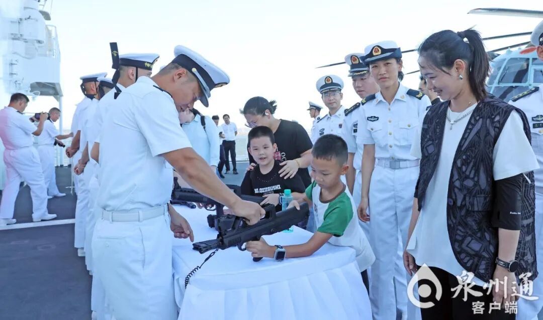 8月28日下午4時(shí)許,海軍“絲路方舟”號(hào)醫(yī)院船??咳莞?。在接下來(lái)的幾天時(shí)間里,“絲路方舟”號(hào)醫(yī)院船將與共建城市泉州開(kāi)啟“城艦永相依 共續(xù)海絲情”一系列共建活動(dòng)。(陳小陽(yáng) 攝) 當(dāng)天下午4時(shí)許,船身懸掛著“愛(ài)我人民愛(ài)我軍 愛(ài)我家鄉(xiāng)愛(ài)我艦”“向家鄉(xiāng)親人問(wèn)好”等紅色橫幅的海軍“絲路方舟”號(hào)醫(yī)院船踏浪而來(lái),緩緩駛近碼頭。岸上,激昂的《歡迎進(jìn)行曲》響起,一場(chǎng)準(zhǔn)備已久、熱烈歡快的歡迎儀式瞬間被“引燃”。泉州黨政機(jī)關(guān)有關(guān)領(lǐng)導(dǎo),泉州軍分區(qū)、泉州市退役軍人事務(wù)局等相關(guān)部門(mén)干部以及各界群眾代表等近200人揮舞著旗幟,熱烈歡呼,以飽滿(mǎn)熱情共同迎接“絲路方舟”??咳莞圻@一歷史時(shí)刻。 歡迎儀式結(jié)束后,軍地領(lǐng)導(dǎo)及各界群眾受邀登艦參觀,在官兵的指引下,走進(jìn)艙室,參觀榮譽(yù)墻、手術(shù)室、診療室、駕駛室等,深入了解海軍“絲路方舟”號(hào)醫(yī)院船入列以來(lái)的發(fā)展歷程和壯美航跡,近距離感受這艘“大白船”的獨(dú)特魅力。