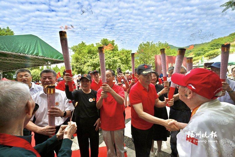 101歲的陳世明和97歲的姜汝煥引出火種,為9位抗日志士后人點燃火炬。 追憶往昔 話傳承使命 歷史的記憶需要實體的承載,精神的傳承需要后人的接續(xù)。 福建省政協(xié)副秘書長、臺盟福建省委會專職副主委許勇鐵代表活動主辦方在致辭中說:“偉大的抗戰(zhàn)精神,是中國人民彌足珍貴的精神財富,更是兩岸同胞共同的歷史記憶與精神紐帶?!?/p> 老紅軍、抗戰(zhàn)時期八路軍120師排長王玉清之子王寧表示:“兩年前,103歲的父親謝世。去世時,他唯一的遺憾是沒有看到兩岸統(tǒng)一。作為兒子,我覺得對父親最好的告慰,就是傳承紅色基因,繼承和發(fā)揚革命精神。兩岸統(tǒng)一那天,我一定會到這里告慰九泉之下的父親,這是他最想聽到的好消息,實現(xiàn)中華民族偉大復(fù)興是父親一生奮斗的目標(biāo)?!?/p> “抗戰(zhàn)時期,旅居菲律賓的愛國華僑以捐款、捐飛機、組團回國參戰(zhàn)等實際行動積極支持祖國的抗日戰(zhàn)爭,并且成立了唯一的一支海外抗日武裝——菲律賓華僑抗日游擊支隊,與菲律賓人民并肩打擊日本侵略者……”菲律賓華僑抗日游擊支隊第五大隊指導(dǎo)員郭鋼之子郭建安作為海外華僑抗日志士后人代表發(fā)言,講述先輩們的熱血故事,展現(xiàn)了海外僑胞的家國情懷和國際主義精神。 “抗戰(zhàn)勝利,臺灣光復(fù);山河同氣,永續(xù)傳承?!碑?dāng)天,臺灣抗日志士后人與大陸創(chuàng)作者聯(lián)合手書的作品寄至現(xiàn)場,并捐贈給三山人文紀(jì)念園收藏。臺灣著名詩人、書法家陳志聲創(chuàng)作的詩詞也同步捐贈。