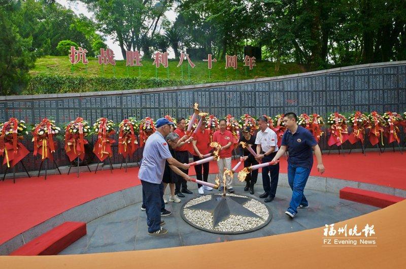 社會各界人士敬獻鮮花。 深切緬懷 燃傳承火種 佩戴起特制的抗戰(zhàn)勝利80周年紀(jì)念徽章,在紀(jì)念墻上鄭重簽名,與采集來的火種合影留念……8月31日8時許,福州抗日志士紀(jì)念墻前已是人頭攢動,早早來到這里的人們,以各種方式表達(dá)崇敬之情。 凝視福州抗日志士紀(jì)念墻,墻上8564個名字熠熠生輝,每一個名字背后,都是一位在民族危亡之際挺身而出的抗日志士,都有著一段可歌可泣的英雄故事?!拔腋赣H是抗日志士鄭其土?!编嵎礁稍诟赣H名字旁貼上小小的五星紅旗,“這是告慰先人的一種方式,我們沒有忘記他們,大家都沒忘記他們!”記者看到,許多抗日志士姓名旁都貼上了小小的五星紅旗。 戴著紀(jì)念徽章的兩位抗日志士——97歲姜汝煥和101歲陳世明的到來,吸引了眾人的目光。“很高興,看到很多熟人?!标愂烂餍呛堑啬贸鲈缫褜懞玫膬蓮堉杏⑽念}字贈與福建省閩浙贛邊區(qū)革命史研究會會長凌冰。一張寫著“大力弘揚偉大抗戰(zhàn)精神”,一張寫著“銘記歷史 緬懷先烈”,這是老人對后輩的諄諄囑托。 9時03分,穿透時空的號角聲響起。這號角,是告慰,亦是召喚,喚醒人們共同的歷史記憶。“勝利?和平——紀(jì)念中國人民抗日戰(zhàn)爭暨世界反法西斯戰(zhàn)爭勝利80周年活動”在號角聲中拉開帷幕。隨后,全場肅立,《義勇軍進行曲》的激昂旋律回蕩在紀(jì)念園上空,嘉賓們向福州抗日志士紀(jì)念墻行注目禮,用最莊重的方式致敬英烈。 活動現(xiàn)場,工作人員向抗日志士姜汝煥和陳世明獻花;主辦方及參與單位代表向紀(jì)念墻敬獻花籃并整理綬帶。朵朵鮮花寄托哀思,條條綬帶承載敬意,訴說著后人們對前輩先烈的深切緬懷。 抗戰(zhàn)的精神需要薪火相傳?,F(xiàn)場大屏幕上播放的“薪火八閩”采集視頻,帶領(lǐng)大家回顧1個月來的火種采集歷程——從福州八一七烈士墓到福建省閩浙贛邊區(qū)革命紀(jì)念碑、福建省閩粵贛邊區(qū)革命紀(jì)念碑,從閩侯大湖抗戰(zhàn)遺址到陳紹寬上將故居、福州解放紀(jì)念碑、福州長江支隊紀(jì)念園,每一處都是一段悲壯史詩,每一簇火苗都是一粒不滅的精神種子。 在眾人注視下,抗日志士姜汝煥和陳世明從火種臺引出火種,并為9位抗日志士后人點燃火炬,再由他們共同執(zhí)火炬點燃“抗戰(zhàn)精神傳承長明火”。跳躍的火焰升騰而起,象征著無數(shù)抗日志士用鮮血和犧牲鑄就的抗戰(zhàn)精神將在一代又一代后人手中永續(xù)傳承、永不熄滅。