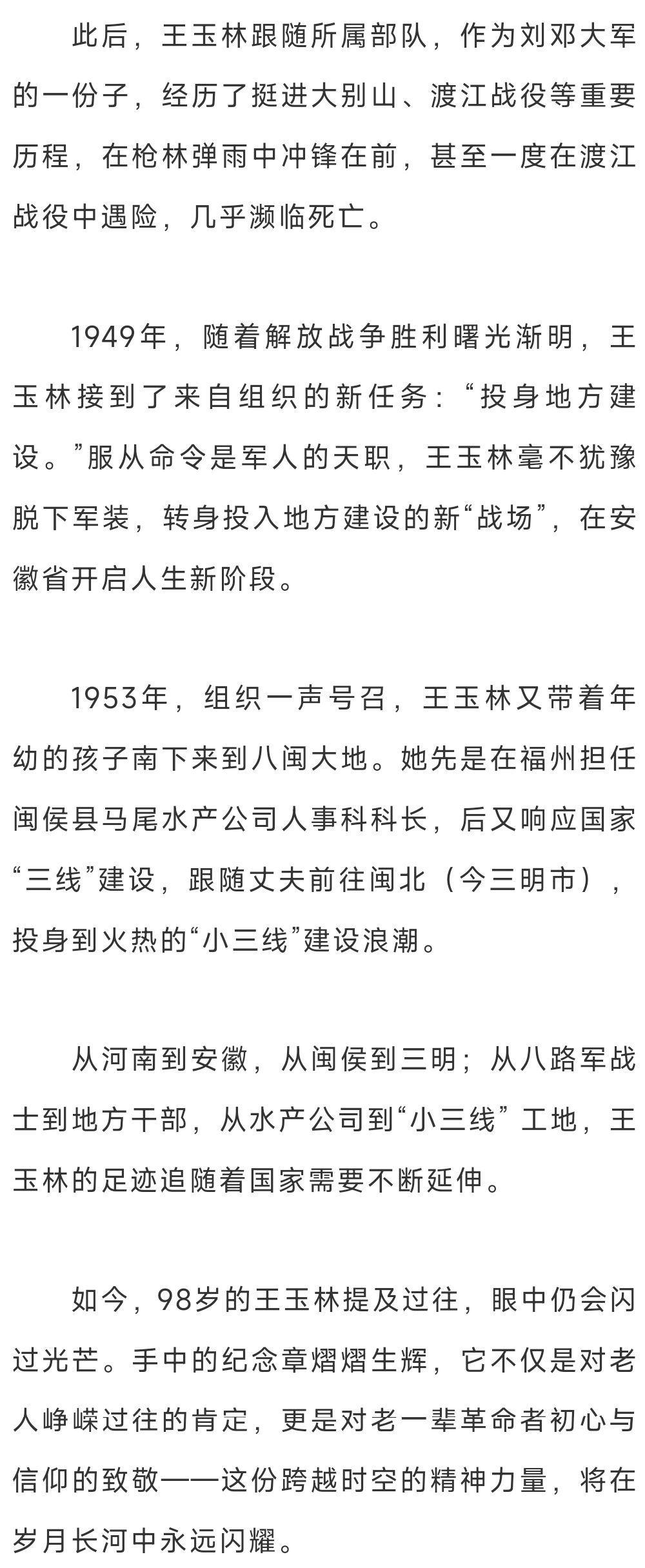 編者按: 為紀(jì)念中國人民抗日戰(zhàn)爭暨世界反法西斯戰(zhàn)爭勝利80周年,深入挖掘抗戰(zhàn)老兵事跡,傳承紅色基因,省退役軍人事務(wù)廳聯(lián)合各地市退役軍人事務(wù)部門開展走進(jìn)抗戰(zhàn)老兵家庭,重溫抗戰(zhàn)歷史系列活動(dòng)。廳官網(wǎng)官微開辟“致敬抗戰(zhàn)老兵”專欄對(duì)此進(jìn)行系列宣傳,今日推出《98歲八路軍女戰(zhàn)士王玉林,收到這枚金燦燦的紀(jì)念章》的故事。 日前,一枚承載著敬意的“中國人民抗日戰(zhàn)爭勝利80周年”紀(jì)念章,由閩侯縣農(nóng)業(yè)農(nóng)村局工作人員帶到三明市,送到了今年98歲高齡,曾在閩侯縣工作生活過的八路軍女戰(zhàn)士王玉林家中。