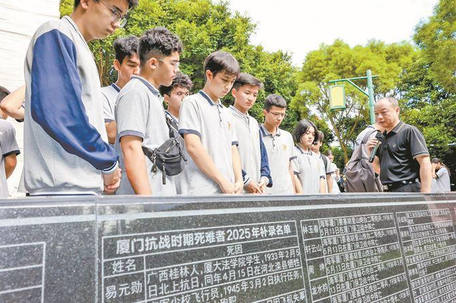 日前,廈門市中學(xué)生在五通燈塔公園聆聽英烈故事,觀看廈門抗戰(zhàn)時(shí)期死難者名錄碑及2025年補(bǔ)錄名單。(唐光峰 攝)