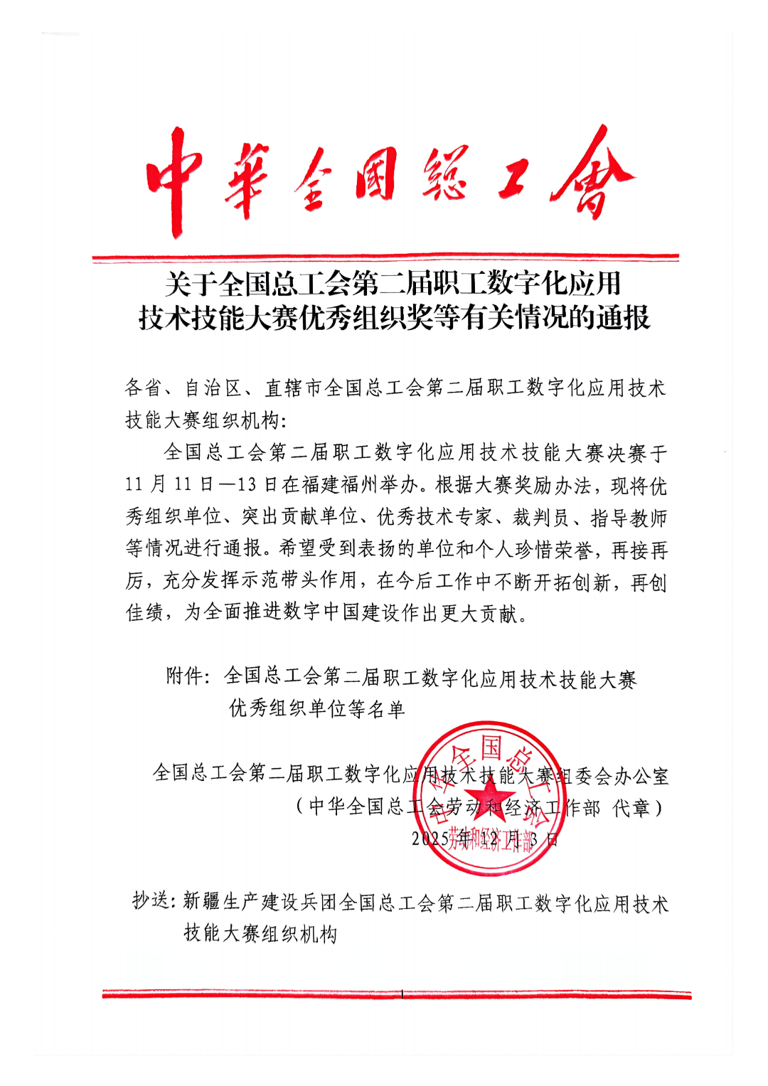 近日,全國(guó)總工會(huì)第二屆職工數(shù)字化應(yīng)用技術(shù)技能大賽決賽在福州圓滿落幕。省市場(chǎng)監(jiān)管局憑借在大賽組織保障中的扎實(shí)作為,獲評(píng)“突出貢獻(xiàn)單位”榮譽(yù)。