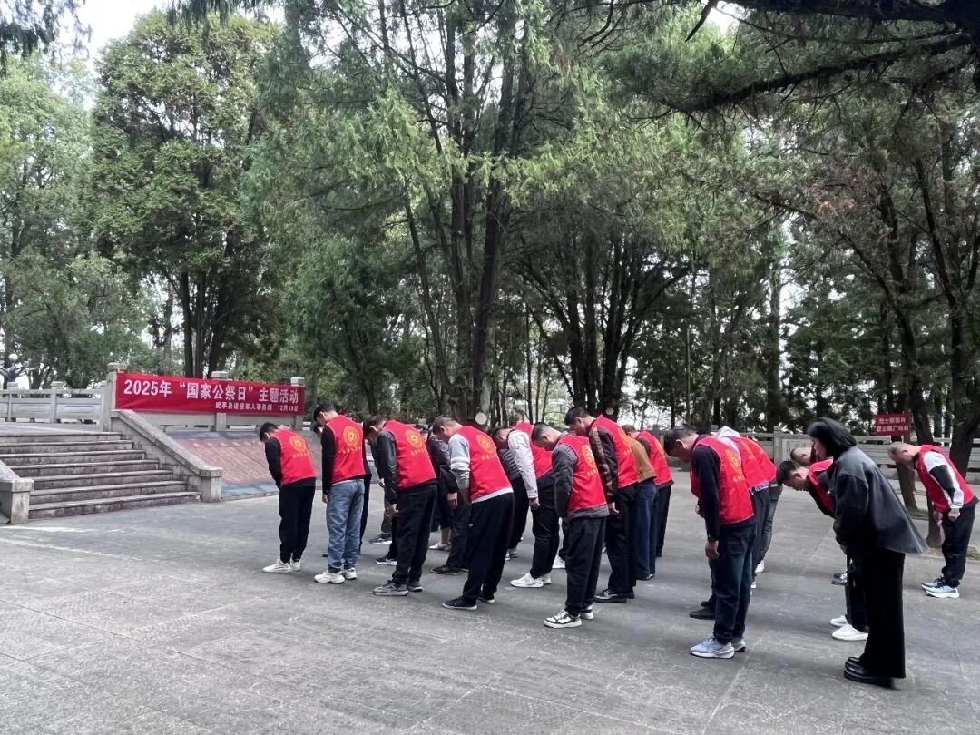 儀式結(jié)束后,全體人員前往烈士陵園,瞻仰默哀并緩步繞行紀念碑一周,接受革命傳統(tǒng)教育,通過實地感受、參觀學習,深切感受革命先烈的不朽精神,在緬懷與追思中進一步堅定傳承紅色基因、守護和平未來的信念與決心。 “當國旗經(jīng)過我手中時,內(nèi)心無比激動。和平來之不易,我們新時代少年定將悲痛化為力量,勤奮學習、強健體魄,傳承愛國精神,守護今日和平?!睂W生代表林江樾表示。 黨員代表傅興華說:“一名黨員就是一面旗幟,觸摸著胸前的黨員徽章,更感責任重大。我們將牢記歷史,在工作中勇挑重擔,在生活中傳遞正能量,把對歷史的銘記轉(zhuǎn)化為建設(shè)家園、守護和平的實際行動?!?/p> 12月13日,龍巖市武平縣退役軍人事務(wù)局聯(lián)合縣司法局組織職工干部和社區(qū)矯正對象前往縣革命烈士陵園開展國家公祭日主題活動,以肅穆的儀式緬懷英烈,以實際行動銘記歷史,以紅色教育淬煉思想。