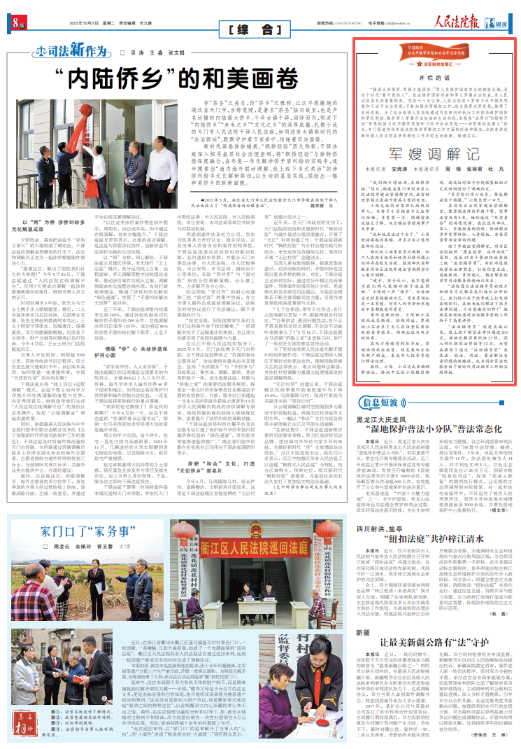 編者按:近日,《人民法院報》“學(xué)思踐悟習(xí)近平強(qiáng)軍思想和習(xí)近平法治思想——涉軍維權(quán)故事匯”欄目,報道廈門市同安區(qū)人民法院成立法院軍嫂法官調(diào)解室,積極推行“法治輔導(dǎo)員”制度,用法治力量保障官兵合法權(quán)益的暖心實踐。請看報道——