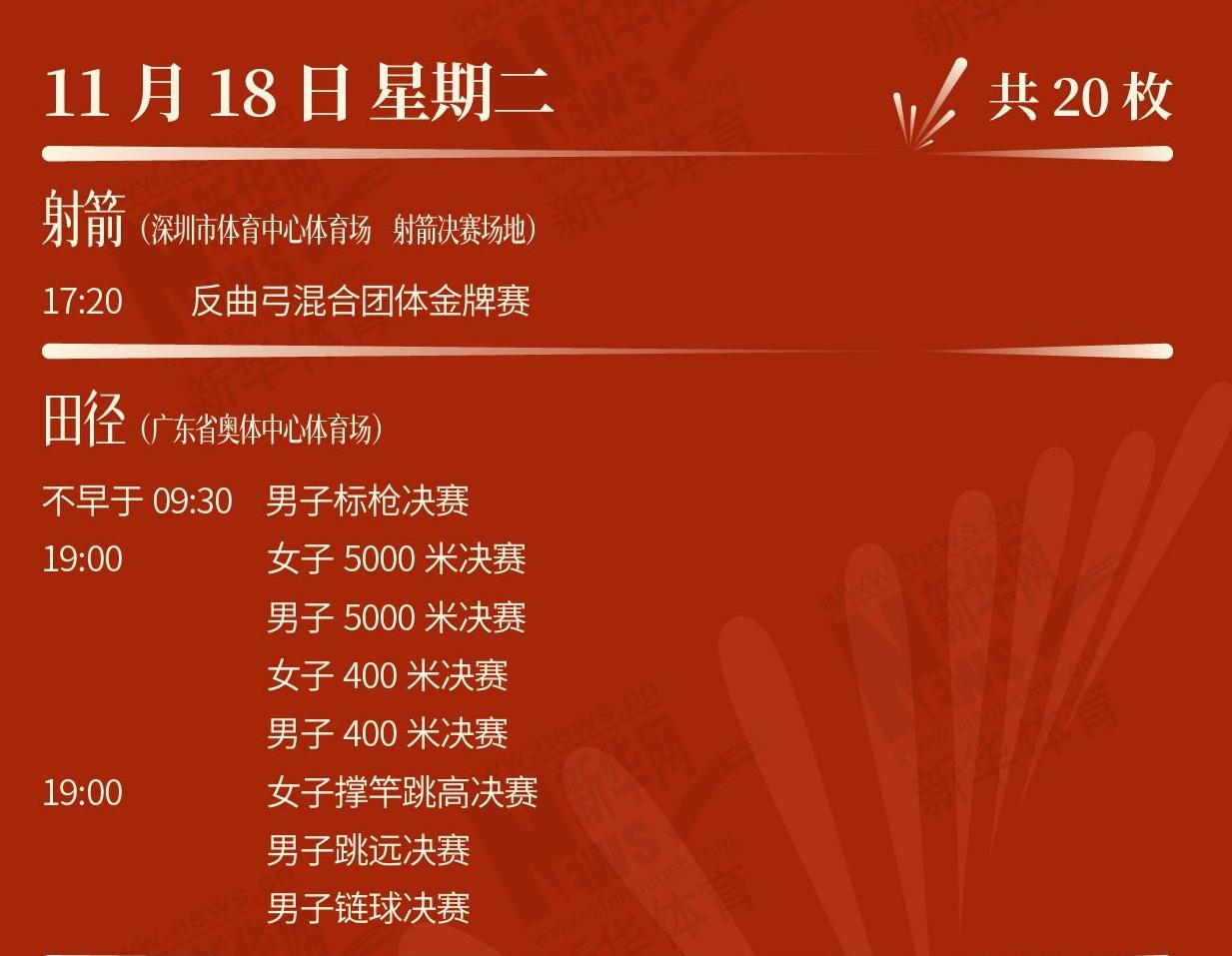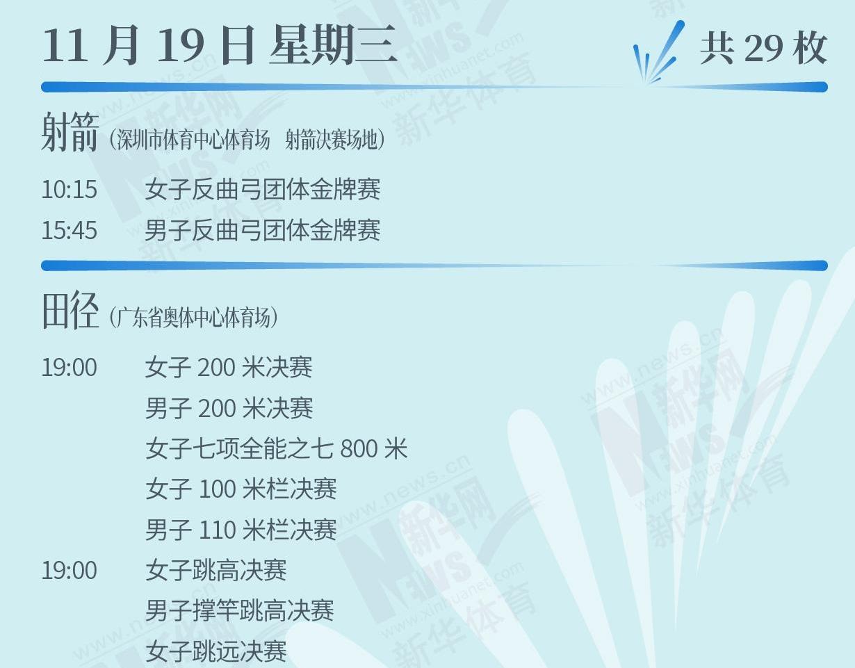 第十五屆全運(yùn)會,正在如火如荼進(jìn)行中。11月19日,運(yùn)動健兒將向多個項目發(fā)起獎牌沖擊,一起來看看賽程表。[詳細(xì)]