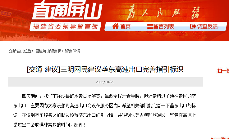日前,有網(wǎng)友反映,三明壟東高速出入口設(shè)在服務(wù)區(qū)內(nèi)很容易錯(cuò)過(guò),針對(duì)此事,東南網(wǎng)記者先后聯(lián)系了相關(guān)部門(mén),均得到的回復(fù)是“完善標(biāo)識(shí)的責(zé)任不在自己”。