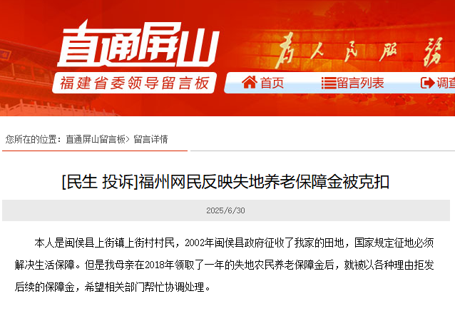 近日,福州閩侯網(wǎng)友林先生通過(guò)《直通屏山》反映,當(dāng)?shù)夭簧俅迕裨谡鞯睾笞孕袇⒓恿遂`活就業(yè)人員養(yǎng)老保險(xiǎn),到退休年齡時(shí),當(dāng)?shù)貐s以此為由不予發(fā)放被征地農(nóng)民養(yǎng)老保障金,亦未給予自繳保費(fèi)補(bǔ)貼。福州多地存在類似情況,林先生認(rèn)為,此舉剝奪了失地農(nóng)民的合法權(quán)益,違背了中央政策精神與省級(jí)規(guī)定。